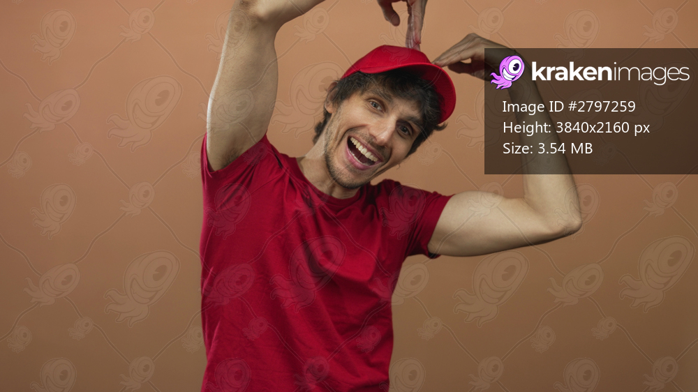 Delivery man wearing red cap and tshirt shapes heart gesture with his hands in a studio lit by peach light; joy.