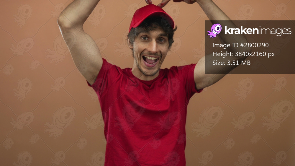 Delivery man wearing red cap and tshirt shapes heart gesture with his hands in a studio lit by peach light; joy.