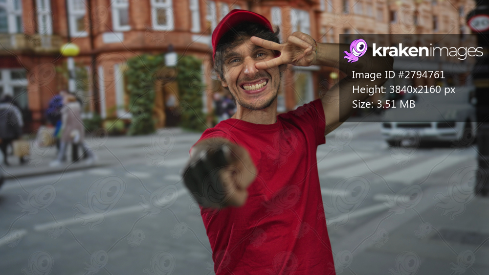 Delivery man wearing red shirt and cap points finger at camera on street while raising two fingers for peace sign; excitement.