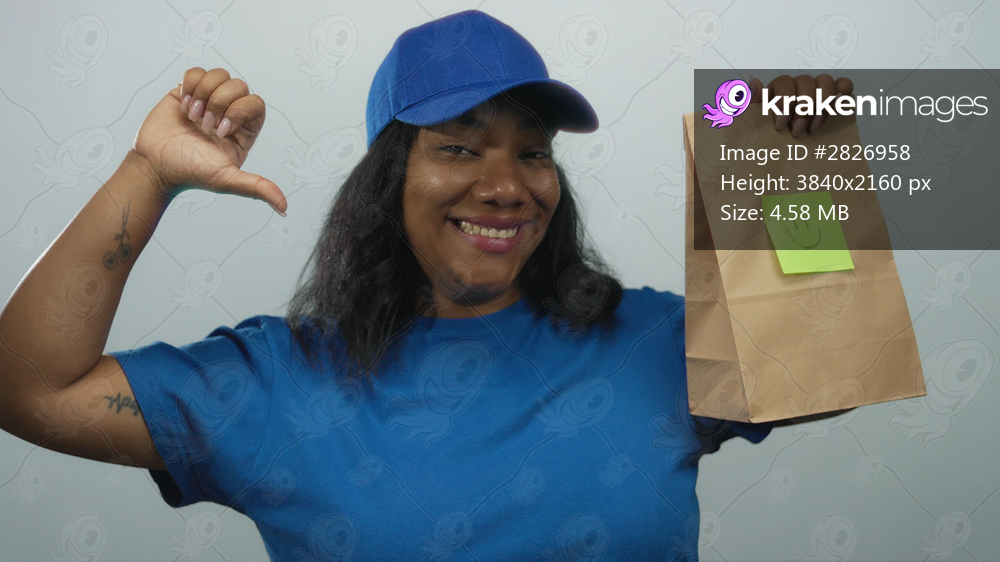 Delivery woman holds a brown paperbag against a pale blue studio wall and points her thumb to herself with a smile; pride empowerment confidence.