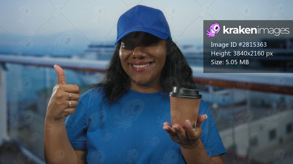 Delivery woman in blue cap and shirt points finger to coffee cup on building deck; service hospitality warmth.