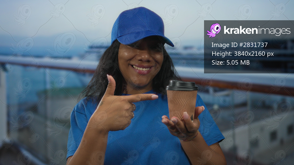 Delivery woman in blue cap and shirt points finger to coffee cup on building deck; service hospitality warmth.