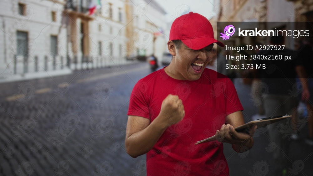 Delivery worker in red cap and shirt pointing to clipboard on cobblestone street, smiling and fist pumping; joy success.