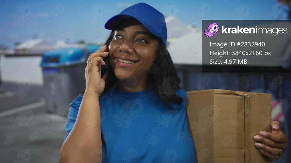 Deliverywoman holds box with one hand and talks on phone on city street by large trash container; duty.