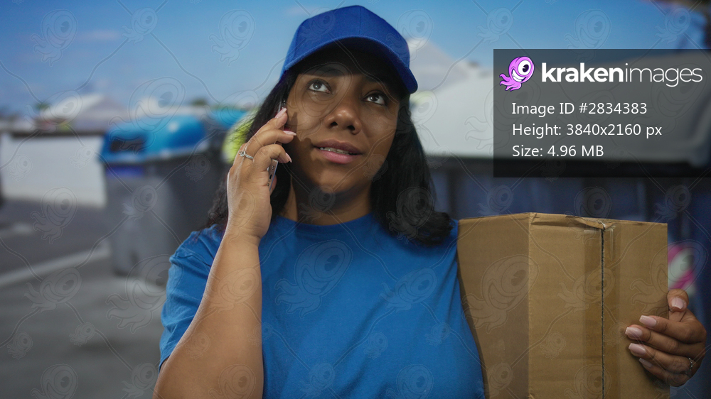 Deliverywoman holds box with one hand and talks on phone on city street by large trash container; duty.