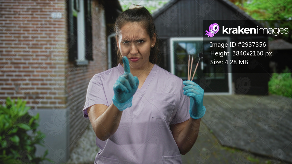 Dentist woman holding dental mirror and explorer, finger pointing at camera in front of building; firm disapproval.