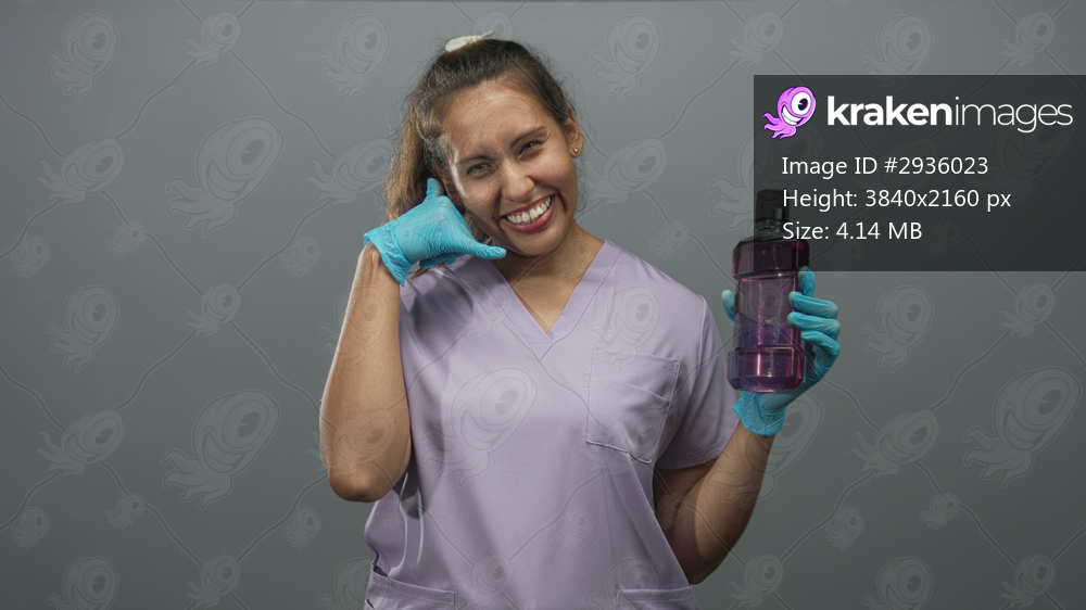 Dentist woman holding purple mouthwash bottle and gloved hand making call gesture in gray studio; friendly oral care.