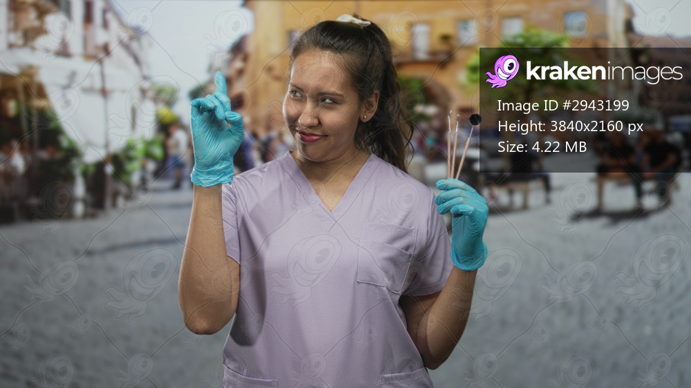 Dentist woman points finger while holding dental mirrors and instruments in blue gloves on cobbled street with blurred cafe scene; playful confidence.