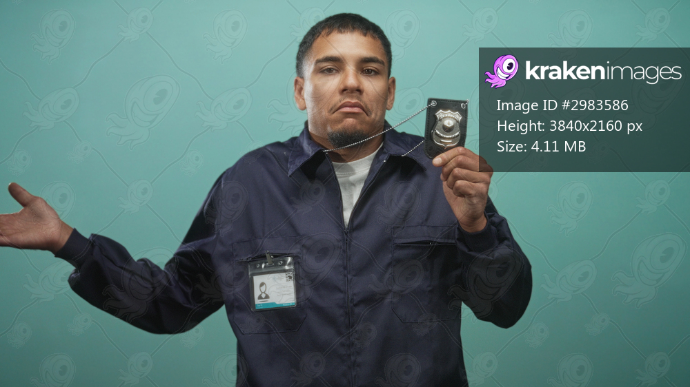 Detective man wearing navy jacket holds police badge and id in hand and shrugs shoulders in studio; doubt reluctant authority.