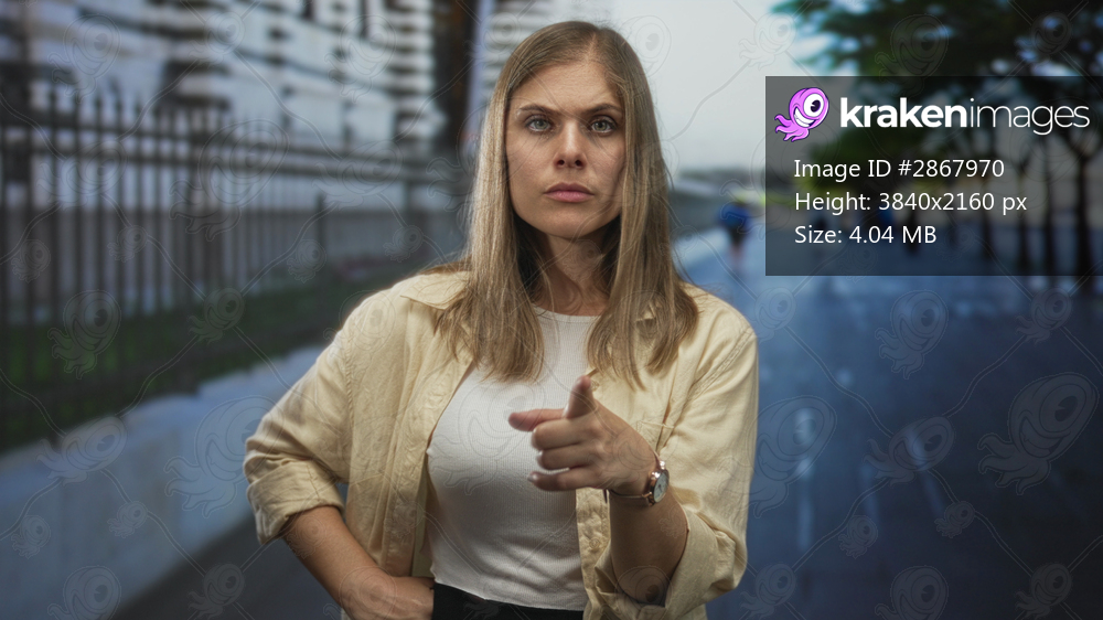 Determined young blonde woman points index finger toward camera on sunny urban street; confidence.