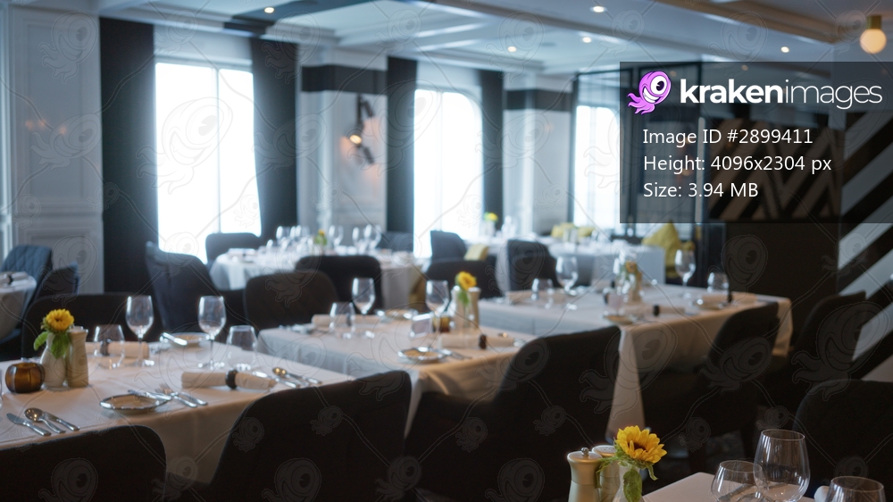 Dining room blurred bokeh interior showing arranged tables, glassware and floral accents with shallow depth of field and soft ambient lighting; background copyspace backplate calm.