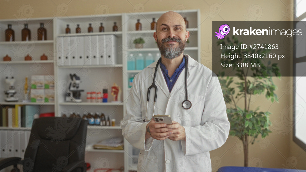Doctor with beard and stethoscope in clinic using smartphone in front of shelves and plant.