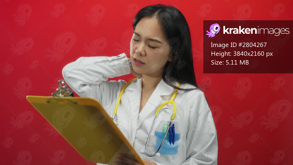 Doctor examines clipboard thoughtfully with stethoscope around neck against bright red background, highlighting healthcare professionalism.