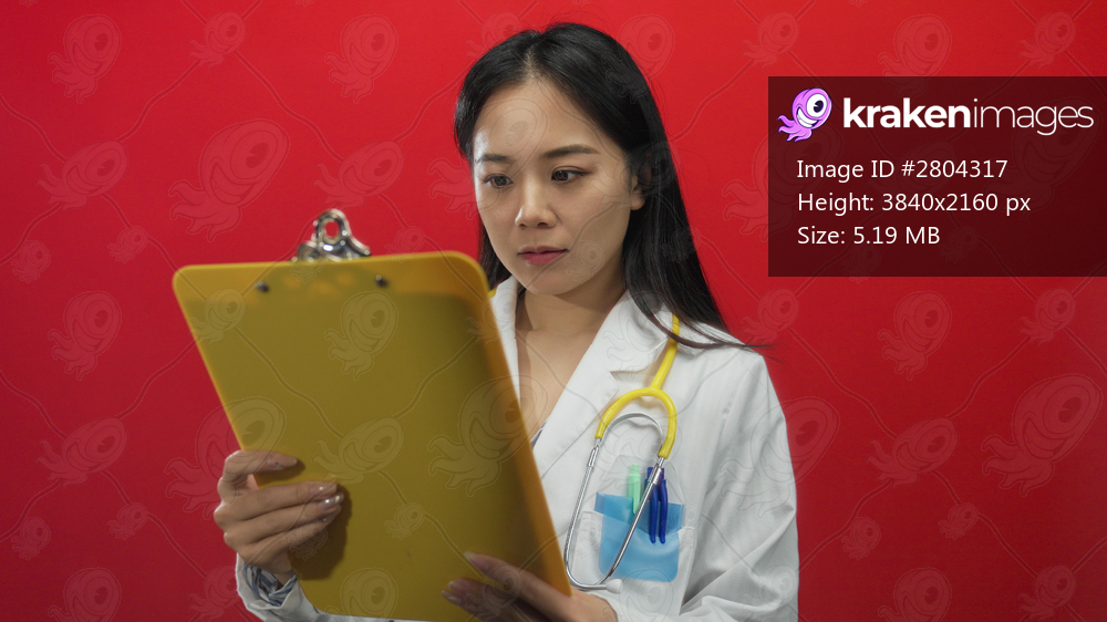 Doctor examines clipboard thoughtfully with stethoscope around neck against bright red background, highlighting healthcare professionalism.