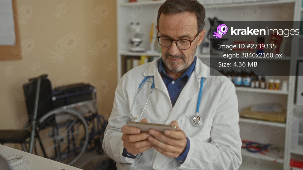 Doctor examining smartphone in clinic setting wearing lab coat surrounded by medical equipment and wheelchair conveying professionalism and healthcare environment. - Kraken Images