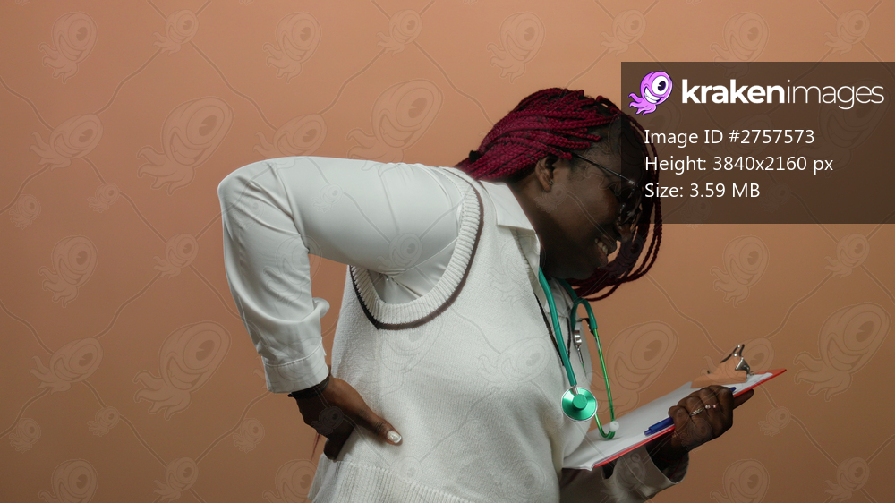 Doctor experiencing back pain holds clipboard, standing against brown background, showcasing discomfort in healthcare setting.