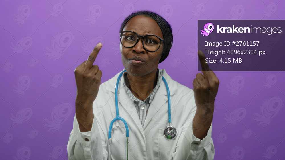 Doctor expressing frustration while wearing glasses and a stethoscope against a vibrant purple background, signaling with both middle fingers and conveying emotion. - Kraken Images