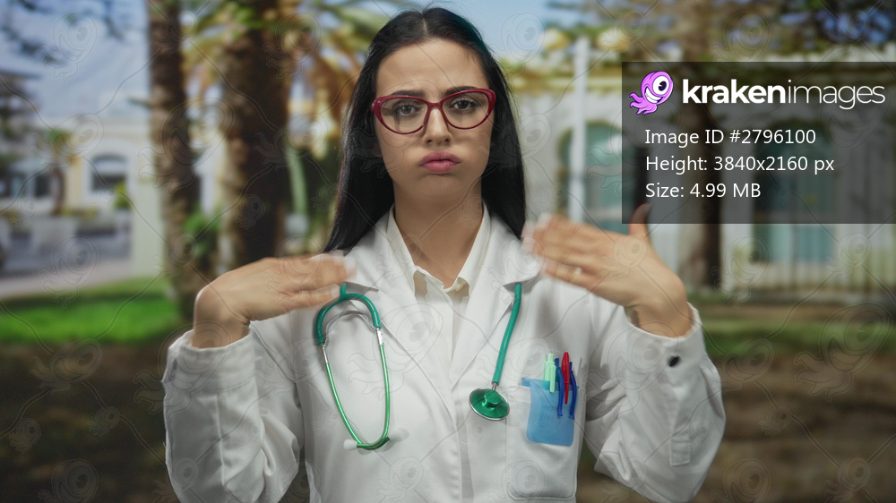 Doctor fanning herself with hands on a hot day outdoors, showcasing the struggle of a young woman in medical uniform with a stethoscope in a street setting. - Kraken Images