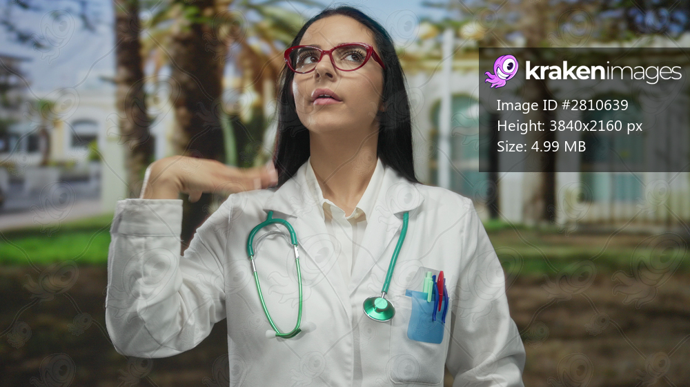 Doctor fanning herself with hands on a hot day outdoors, showcasing the struggle of a young woman in medical uniform with a stethoscope in a street setting. - Kraken Images