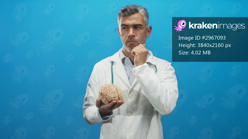 Doctor holding an anatomical brain model in left hand and hand on chin gesture, wearing white coat and stethoscope in studio; pensive reflection.