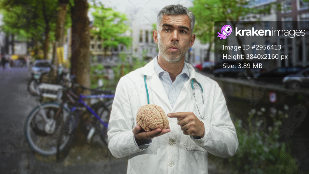 Doctor holds brain model and points finger to brain on a canal street lined with bicycles and buildings, wearing white coat and stethoscope; educational. - Kraken Images