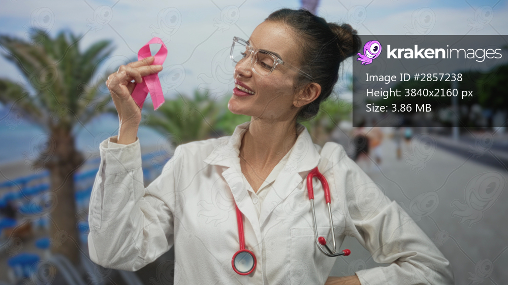 Doctor holds pink ribbon at eye level on sunlit seaside promenade; breast cancer awareness solidarity.