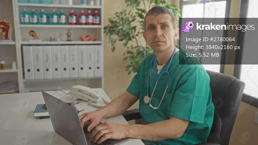 Doctor in clinic office wearing a uniform with a stethoscope works on a laptop surrounded by medical files and equipment creating a professional healthcare setting. - Kraken Images
