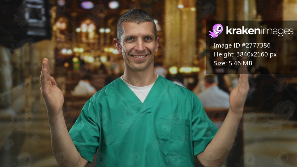Doctor in green uniform making a large gesture with hands inside a church, smiling confidently, with blurred congregation background, highlighting calm and serene atmosphere. - Kraken Images