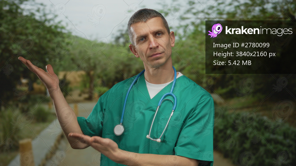 Doctor in green uniform with stethoscope presenting something outdoors in a lush park environment, conveying health and calmness.