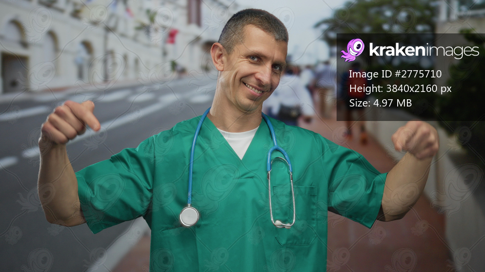 Doctor in green uniform with stethoscope smiling on urban street, providing healthcare outdoor with people walking by on a sunny day.