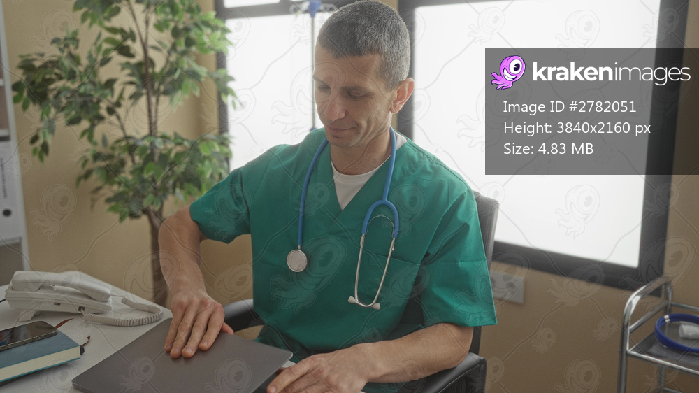 Doctor in green uniform with stethoscope using laptop in a hospital clinic office with organized files and plants indoors.