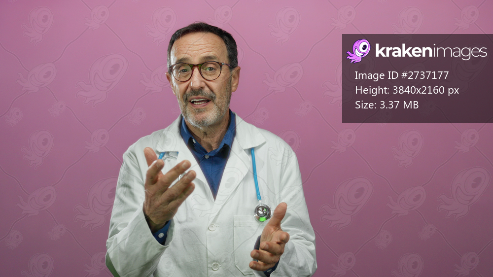 Doctor in white coat gestures expressively against pink background conveying medical concept with stethoscope around neck under studio lighting for health communication visuals - Kraken Images