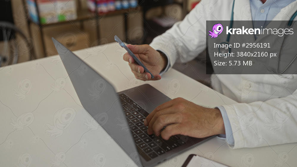 Doctor in white coat types on a laptop with one hand while holding a smartphone in the other, stethoscope visible on chest in clinic building; quiet focus. - Kraken Images