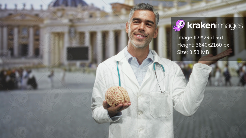Doctor man holding a brain and presenting with palm up in a historic public square with colonnade building; curiosity knowledge.
