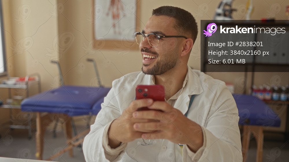 Doctor man holding smartphone and tapping screen by examination table in clinic building; calm concentration.