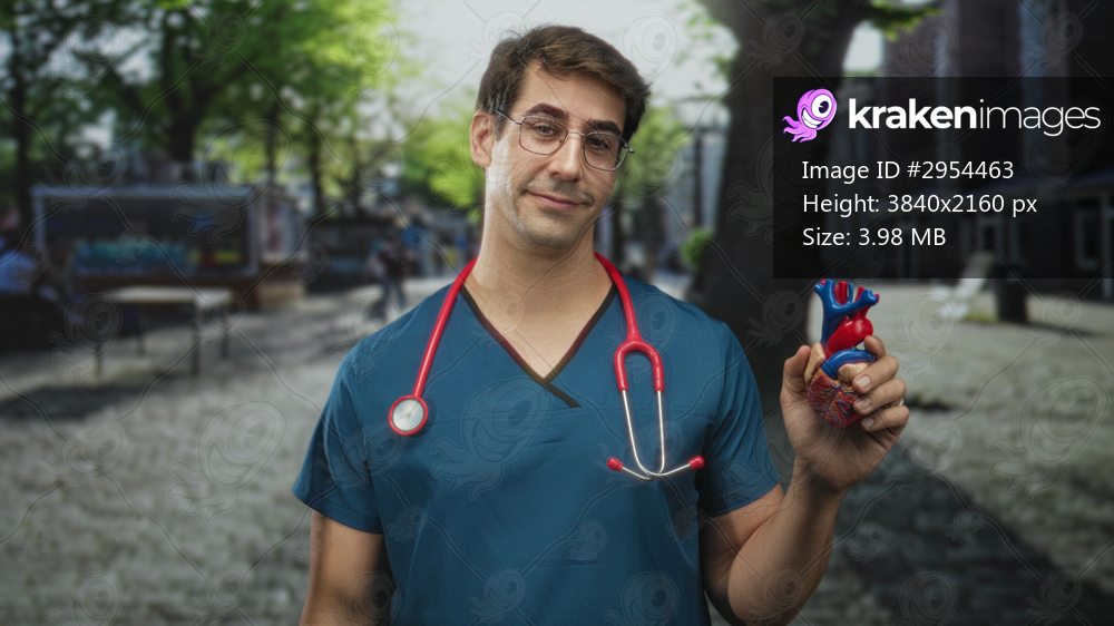 Doctor man in blue scrubs holding an anatomical heart model in one hand, finger to temple gesture on a cobblestone street; health education compassion.
