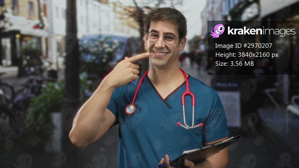 Doctor man in blue scrubs points finger to cheek holding clipboard with red stethoscope on street; friendly confidence.