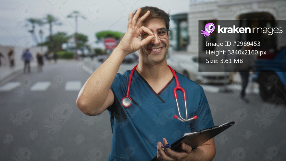 Doctor man in blue scrubs with red stethoscope holds clipboard and makes ok sign over eye on street near crosswalk and parked cars; reassurance care.