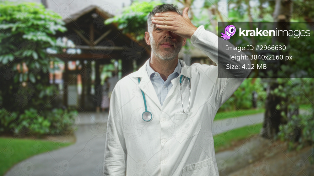 Doctor man in lab coat with stethoscope, hand on forehead at building entrance by garden path and trees, looking weary; fatigue concern.