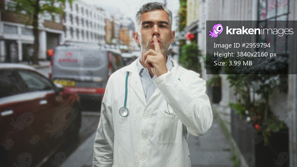 Doctor man in labcoat with stethoscope presses finger to lips on street near parked cars and storefronts; quiet authority.