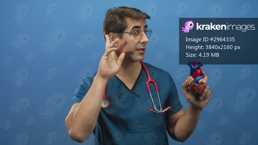 Doctor man in scrubs holding anatomical heart model and clenching fist in studio; concern care education.