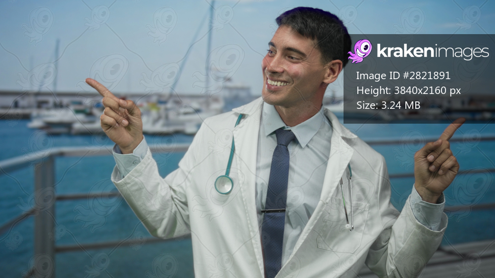 Doctor man in white coat and tie with stethoscope smiling and pointing finger toward boats on a sunny seaside port walkway; confidence.