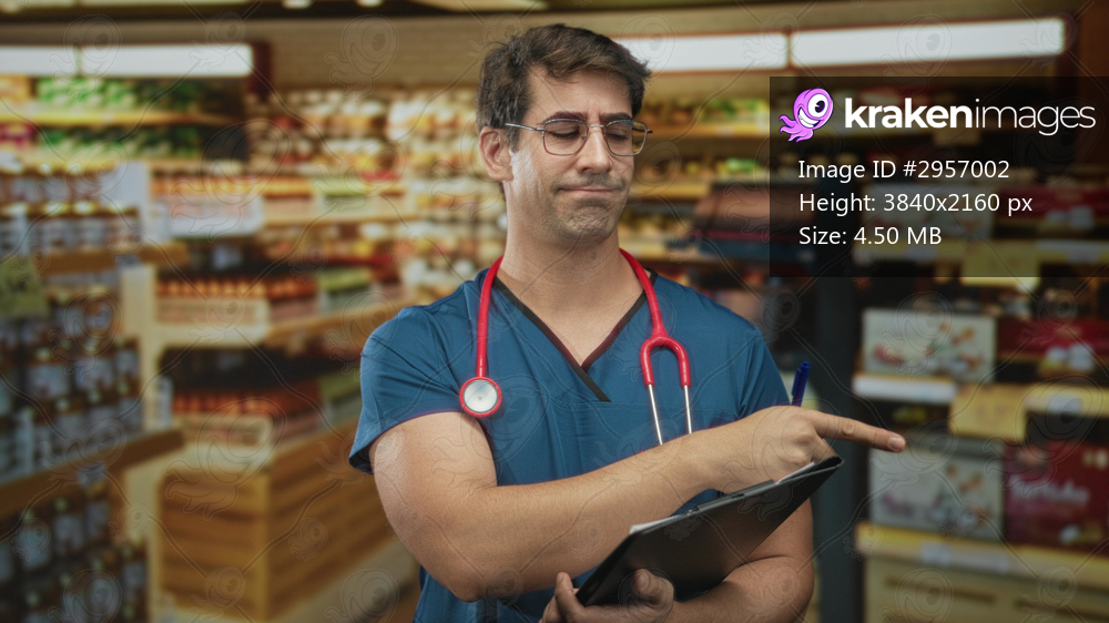 Doctor man pointing finger while holding clipboard and pen inside a supermarket building; health advice concern.