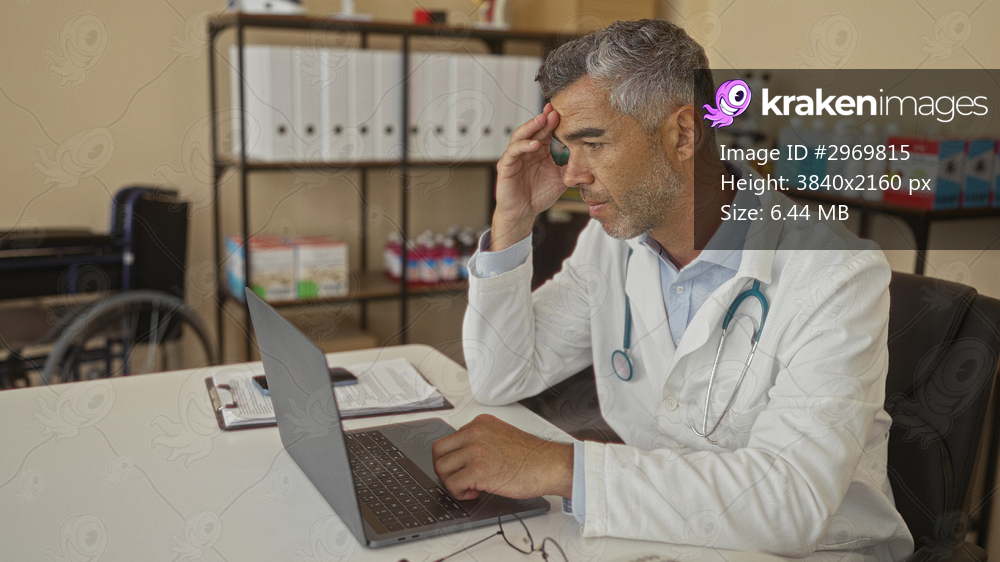 Doctor man typing on laptop with stethoscope, hands on keyboard and clipboard nearby in clinic; focused concern.