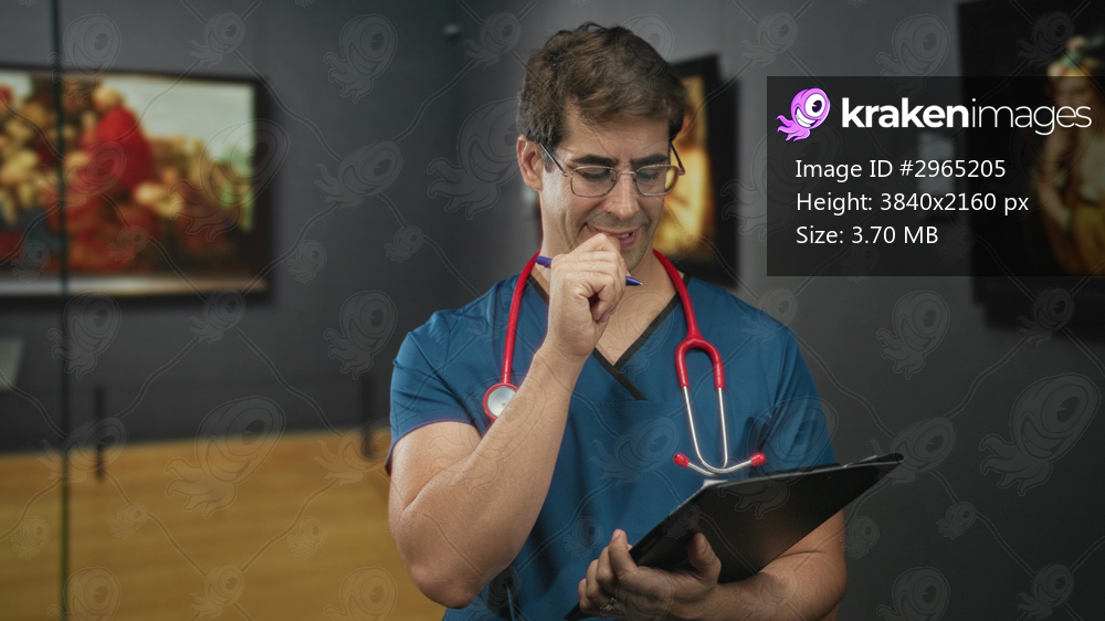 Doctor man writing on clipboard with stethoscope and pen in museum building while wearing scrubs and glasses, looking down at chart; quiet concentration. - Kraken Images