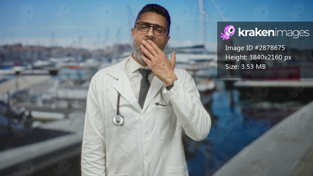 Doctor man yawning with hand over mouth and stethoscope on street near boats at a port; fatigue work stress.