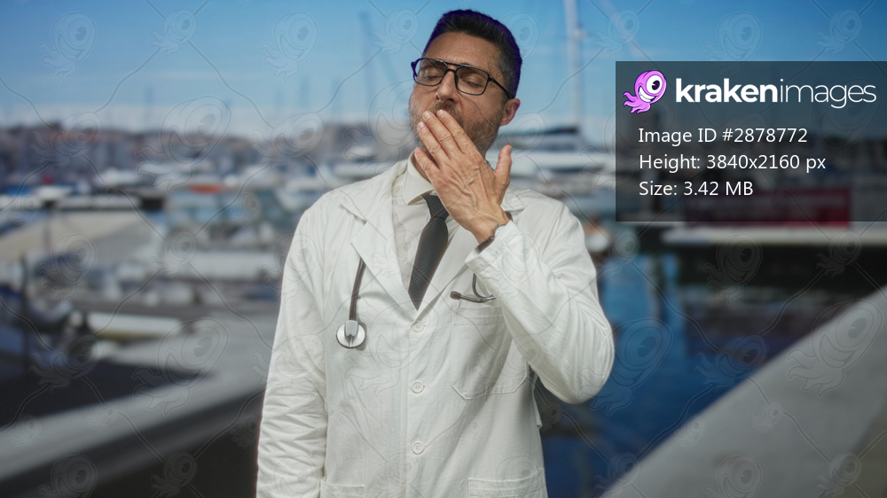 Doctor man yawning with hand over mouth and stethoscope on street near boats at a port; fatigue work stress.