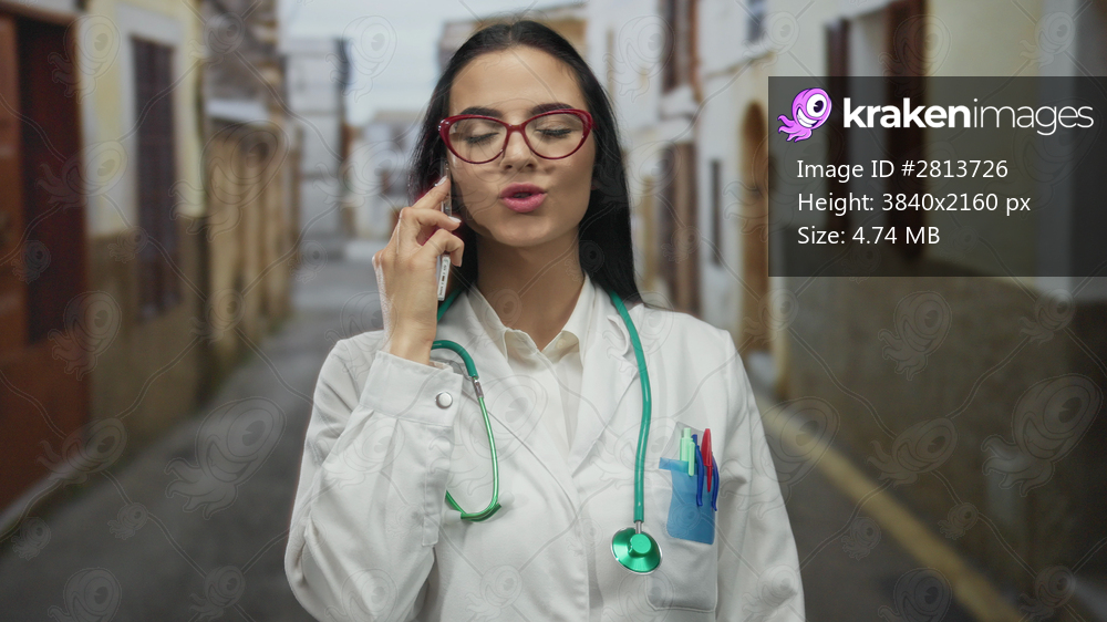 Doctor on smartphone wearing uniform and stethoscope, standing on a quiet street, conveying professionalism and engagement in a casual outdoor environment. - Kraken Images