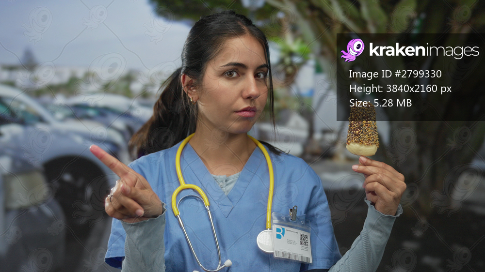 Doctor raising finger in refusal while holding icecream on street beside parked cars wearing scrubs and stethoscope; restraint.