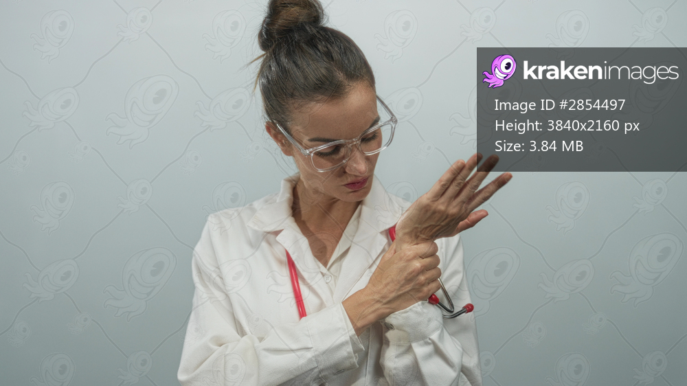 Doctor with red stethoscope holds wrist in grey studio with young hispanic expression of pain; discomfort.